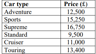 A car dealer specialises in selling six types of cars named simply as ‘Touring’, ‘Cruiser’, ‘Standard’, ‘Supreme’, ‘Sports’ and ‘Adventure’. The shop wants you to create an Excel sales table consisting of the following entries: