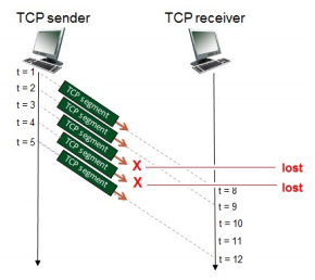Consider the figure below in which TCP a sender and receiver communicate over a connection in which the sender-to-receiver segments may be lost. The TCP sender sends initial window of five segments at t=1,2,3,4,5, respectively. Suppose the initial value of the sender-to-receiver sequence number is 123 and the first five segments each contain 513 bytes. The delay between the sender and the receiver is 7 time units, and so the first segment arrives at the receiver at t=8. As shown in the figure, two of the five segment(s) are lost between the sender and the receiver.