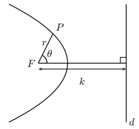 15. Continuing the astronomical theme, we note that astronomers don’t work with cartesian coordinates, but with angles. That is, polar coordinates. We will develop a polar equation for conics. In the following diagram of a conic, the distance from the focus F to the point P is r, the angle from the axis of symmetry is θ, the distance between the focus and the directrix is k, and the eccentricity as usual is e.