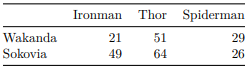 b) A survey of the peoples of Wakanda and Sokovia asked which of three super-heroes they preferred. The following table shows the results.