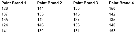 Does a paint brand matter? Four different paint brands advertised for the same type of paint that they have the same drying time. To check the manufacturer’s claims, five samples were tested for each of the paints. The time in minutes until the paint was dry enough for a second coat to be applied was recorded.