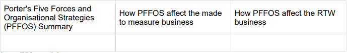 Record your answer to part i. in point form in one column. In the next column, record Helen’s evaluation (part ii.) of the impact that each of the points on the Five Forces and the Organisational Strategies (PFFOS) have on the made to measure business. In the last column record Helen’s evaluation of the impact that each of the PFFOS points have on the RTW businesses. See format below.