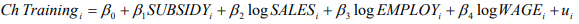 where Ch Trainingi = change rate of annual training hours per employee in firm i; SUBSIDY i = a dummy variable which is set to 1 if firm i was granted a subsidy, 0 otherwise; SALESi log = annual (logarithm) sales; EMPLOYi log = annual average (logarithm) number of employees; and WAGEi log = annual average (logarithm) wage.