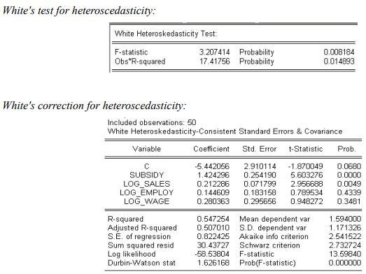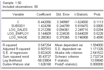 In order to examine how effectively the government subsidies for employee training raised the amount of training provided, we have collected observations from 50 firms. The estimation results of the following regression model are shown below.