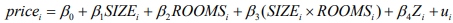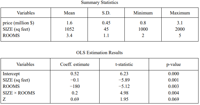 where price = the housing price, SIZE = size measured in square feet, ROOMS = the number of rooms, and Z denotes other control variables. Below are the summary statistics of the variables and the estimation results of the above regression.