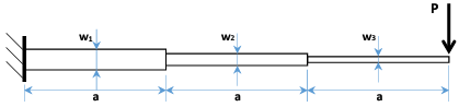 Stepped beam has the following dimensions: depth d = 0.1 m, length a = 1.2 m, widths w1 = 0.08 m, w2 =0.06 m and w3 = 0.04 m. Assume E = 210 GPa and P = 7 kN. Use one element per section and neglect self-weight. Solve by hand and determine:
