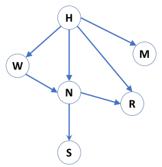 1.1) Write down the joint distribution P(H, W, N, M, R, S) for the above